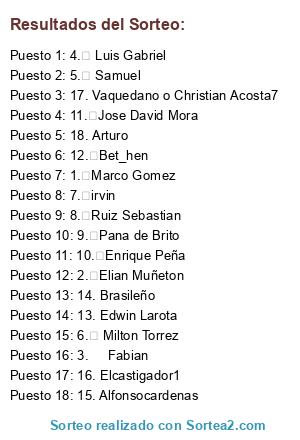 Lista de participantes: 1. Marco Gomez, 2. Elian Muñeton, 3. Fabian, 4. Luis Gabriel, 5. Samuel, 6. Milton Torrez, 7. irvin, 8. Ruiz Sebastian, 9. Pana de Brito, 10. Enrique Peña, 11. Jose David Mora, 12. Bet_hen, 13. Edwin Larota, 14. Brasileño, 15. Alfonsocardenas, 16. Elcastigador1, 17. Vaquedano o Christian Acosta7, 18. Arturo.