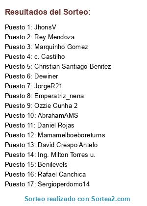 Lista de participantes: Sergioperdomo14, Dewiner, JhonsV, JorgeR21, c. Castilho, Rafael Canchica, David Crespo Antelo, Benilevels, Rey Mendoza, Ing. Milton Torres u., AbrahamAMS, Daniel Rojas, Christian Santiago Benitez, Mamamelboeboreturns, Marquinho Gomez, Emperatriz_nena, Ozzie Cunha 2.