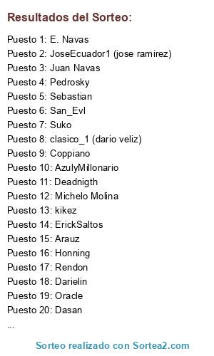 Lista de participantes: Aray, Darielin, Dasan, Deadnigth, E. Navas, Galo Alvarez, Lucho Miguel, MartinLDU, Pedrosky, Pocho, Ponce, PPlopez, Rendon, Sosa, Tamariz, Zocosama, Juan Navas, Oswaldo, Arauz, AzulyMillonario, Batallas, Cely, Coppiano, El10de100pre, GoleadorAzul, Honning, José Quiroz, kikez, PaúlSebastian, Roberto Gavilanes, ErickSaltos, Christorr, Suko, Jose Navas, ElMochi, Michelo Molina, Oracle, Richard Cedeño, Sancocho, San_Evl, JoseEcuador1 (jose ramirez), Oscar Mier, Sebastian, elgargola25(randy toral), clasico_1 (dario veliz).