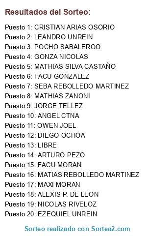 Lista de participantes: NICOLAS RIVELOZ, SEBA REBOLLEDO MARTINEZ, LEANDRO UNREIN, POCHO SABALEROO, ALEXIS P. DE LEON, MATIAS REBOLLEDO MARTINEZ, FACU GONZALEZ, GONZA NICOLAS, CRISTIAN ARIAS OSORIO, MATHIAS ZANONI, MAXI MORAN, MATHIAS SILVA CASTAÑO, FACU MORAN, OWEN JOEL, EZEQUIEL UNREIN, ARTURO PEZO, JORGE TELLEZ, DIEGO OCHOA, ANGEL CTNA, LIBRE.