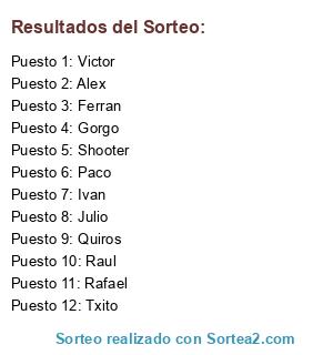 Lista de participantes: Alex, Txito, Ferran, Raul, Paco, Gorgo, Shooter, Quiros, Rafael, Ivan, Julio, Victor.