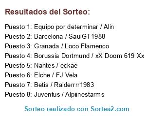 Lista de participantes: Nantes / eckae, Barcelona / SaulGT1988, Elche / FJ Vela, Juventus / Alpiinestarms, Betis / Raiderrrr1983, Granada / Loco Flamenco, Borussia Dortmund / xX Doom 619 Xx, Equipo por determinar / Alin.