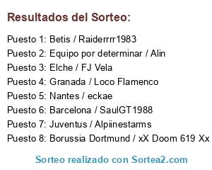 Lista de participantes: Nantes / eckae, Barcelona / SaulGT1988, Elche / FJ Vela, Juventus / Alpiinestarms, Betis / Raiderrrr1983, Granada / Loco Flamenco, Borussia Dortmund / xX Doom 619 Xx, Equipo por determinar / Alin.