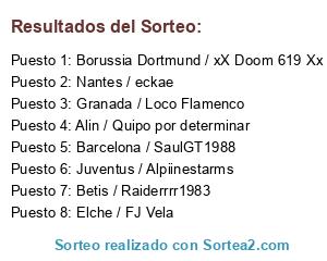 Lista de participantes: Nantes / eckae, Barcelona / SaulGT1988, Elche / FJ Vela, Juventus / Alpiinestarms, Betis / Raiderrrr1983, Granada / Loco Flamenco, Borussia Dortmund / xX Doom 619 Xx, Alin / Quipo por determinar.