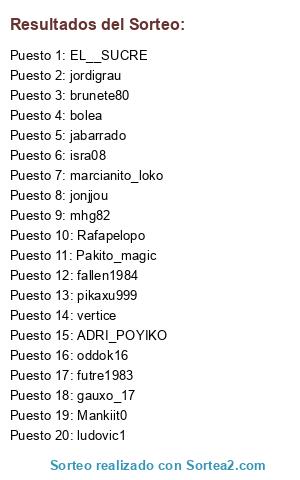 Lista de participantes: mhg82, bolea, jordigrau, Pakito_magic, gauxo_17, pikaxu999, ludovic1, marcianito_loko, oddok16, vertice, isra08, jabarrado, Rafapelopo, fallen1984, jonjjou, ADRI_POYIKO, EL__SUCRE, brunete80, Mankiit0, futre1983.