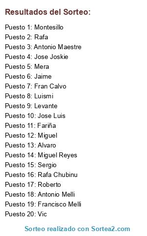 Lista de participantes: Antonio Maestre, Antonio Melli, Alvaro, Fariña, Fran Calvo, Francisco Melli, Jaime, Jose Luis, Jose Joskie, Levante, Luismi, Mera, Miguel, Miguel Reyes, Montesillo, Rafa, Rafa Chubinu, Roberto, Sergio, Vic.