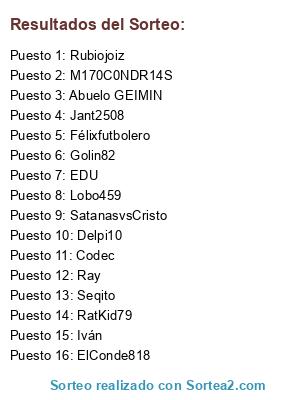 Lista de participantes: Rubiojoiz, EDU, SatanasvsCristo, ElConde818, Lobo459, Codec, RatKid79, Delpi10, M170C0NDR14S, Iván, Félixfutbolero, Seqito, Abuelo GEIMIN, Jant2508, Ray, Golin82.