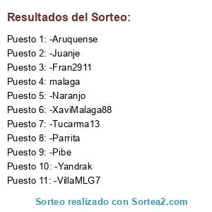 Lista de participantes: -VillaMLG7, -Tucarma13, -XaviMalaga88, -Fran2911, -Yandrak, -Naranjo, -Aruquense, -Juanje, -Parrita, -Prepu, -Pibe, malaga.