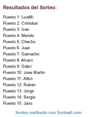 Lista de participantes: Alfon, LuisMi, Jorge, Cristobal, Gabri, Alvaro, Ruben, Sergio, Juan, Garnacho, Jose Martin, Ivan, Maroto, Chechu, Javo.