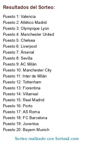 Lista de participantes: Real Madrid, FC Barcelona, Chelsea, Ársenal, Inter de Milán, Manchester City, Bayern Munich, Valencia, Manchester United, Sevilla, Liverpool, Villarreal, AC Milán, Olympique Lyon, Atlético Madrid, Tottenham, Juventus, AS Roma, Fiorentina, Porto.