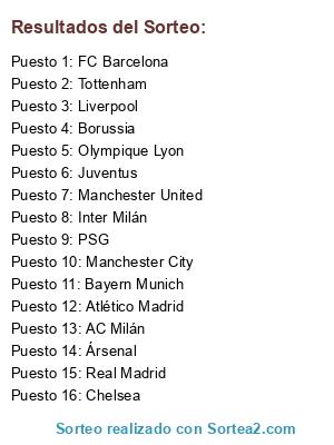 Lista de participantes: Real Madrid, FC Barcelona, Manchester City, Chelsea, Manchester United, Bayern Munich, Tottenham, Liverpool, Juventus, AC Milán, Borussia, Olympique Lyon, Atlético Madrid, PSG, Ársenal, Inter Milán.