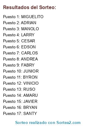Lista de participantes: ANDREA, ADRIAN, JAVIER, VINICIO, MANOLO, CARLOS, BRYAN, CESAR, BYRON, RUSO, EDSON, FABRY, JUNIOR, LARRY, MIGUELITO, AMARU, SANTY.