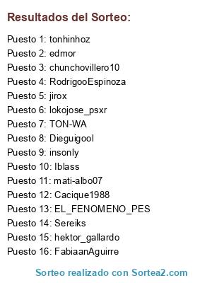 Lista de participantes: Sereiks, lokojose_psxr, FabiaanAguirre, Dieguigool, RodrigooEspinoza, edmor, Cacique1988, Iblass, jirox, insonly , EL_FENOMENO_PES, TON-WA, chunchovillero10, hektor_gallardo, tonhinhoz, mati-albo07.