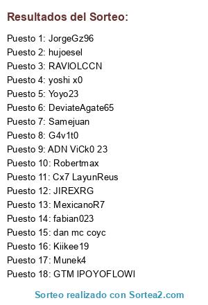 Lista de participantes: DeviateAgate65, Yoyo23, Samejuan, Cx7 LayunReus, JorgeGz96, G4v1t0, fabian023, yoshi x0, Munek4, MexicanoR7, ADN ViCk0 23, JIREXRG, Kiikee19, GTM lPOYOFLOWl, hujoesel, Robertmax, RAVIOLCCN, dan mc coyc.