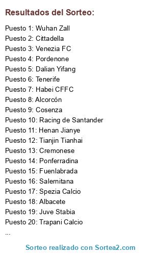 Lista de participantes: Albacete, Alcorcón, Chongqing Dangdai, Cittadella, Cosenza, Cremonese, Dalian Yifang, Elche, Extremadura , Fuenlabrada, Guangzhou RF, Guizhou Renhe, Habei CFFC, Henan Jianye, Juve Stabia, Livorno, Lugo, Pescara, Ponferradina, Pordenone, Racing de Santander, Real Oviedo, Salernitana, Shanghai Shenhua, Spezia Calcio, Tenerife, Tianjin Teda, Tianjin Tianhai, Trapani Calcio, Venezia FC, Virtus Entella, Wuhan Zall.