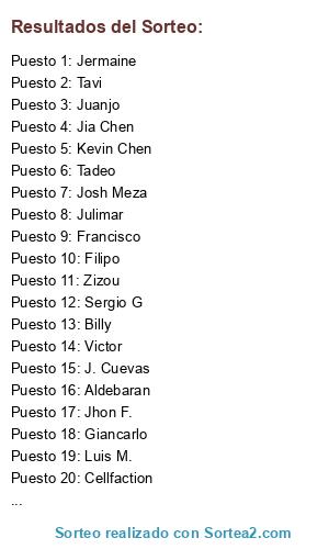 Lista de participantes: Giancarlo, Josh Meza, Omar, Francisco, Obdulio, Tadeo, J. Cuevas, Jermaine, Jia Chen, Zeendy, Kevin Chen, Julimar, Tavi, Aldebaran, Billy, Zizou, Sergio G, Luis M., Hugo Dias, Jhon F., Victor, Filipo, Cellfaction, Juanjo.