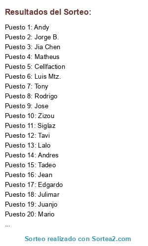 Lista de participantes: Joao, Cellfaction, Jose, Danny, Antonio, Jean, Matheus, David Perez, Gabriel B., Julimar, Tadeo, Luis Mtz., Jorge B., Tavi, Xavier, Jahir, L. Cuevas, Zizou, Brodanger, Fran, Alessandro, Andres, Tony, Gonzalo, Andy, Lalo, Rodrigo, Siglaz, Mario, Jia Chen, Juanjo, Edgardo.