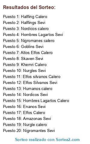 Lista de participantes: Nigromanes calero, Nurgle calero, Nordicos calero, Elfos silvanos Calero, Hombres Lagartos Calero, Khemri Calero, Altos Elfos Calero, Halfling Calero, Elfos Calero, Humanos calero, Nigromantes Sevi, Nurgles Sevi, Skaven Sevi, Nordicos Sevi, Elfos Silvanos Sevi, Hombres Lagartos Sevi, Goblins Sevi, Enanos Sevi, Halflings Sevi, Amazonas Sevi.