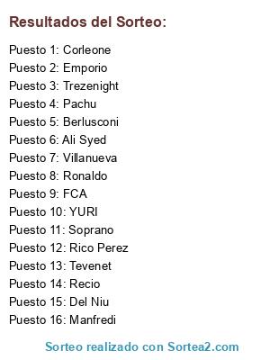 Lista de participantes: Soprano, Corleone, Ali Syed, Emporio, Rico Perez, Berlusconi, YURI, Trezenight, FCA, Ronaldo, Recio, Tevenet, Pachu, Villanueva, Del Niu, Manfredi.
