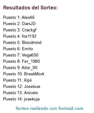Lista de participantes: Fer_1980, Aitor_90, Alex46, Vega650, Joseluss, fox1192, DaniJD, Xipii, Crackgf, Ernito, Aniceto, BreakMork, Bloodmind, josekuja.