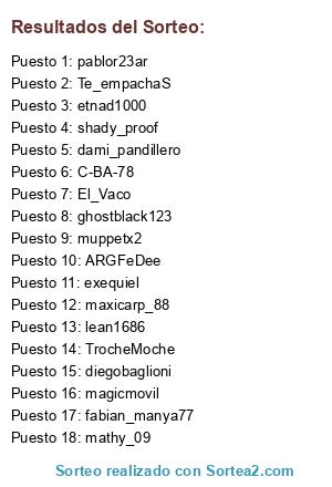 Lista de participantes: Te_empachaS, diegobaglioni, magicmovil, pablor23ar, TrocheMoche, muppetx2, shady_proof, El_Vaco, exequiel, ARGFeDee, fabian_manya77, ghostblack123, lean1686, etnad1000, maxicarp_88, dami_pandillero, mathy_09, C-BA-78.
