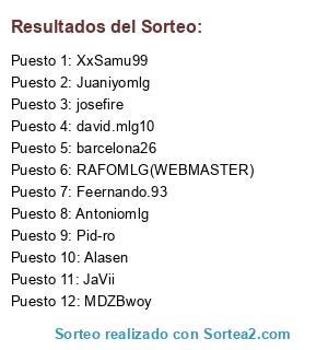 Lista de participantes: Juaniyomlg, barcelona26, Antoniomlg, josefire, MDZBwoy, david.mlg10, Alasen, Pid-ro, RAFOMLG(WEBMASTER), JaVii, Feernando.93, XxSamu99.