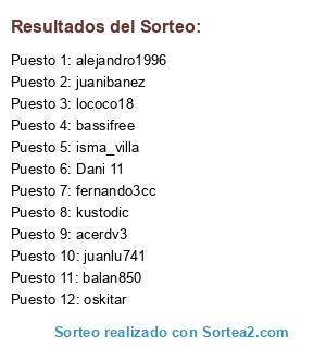 Lista de participantes: kustodic, fernando3cc, Dani 11, alejandro1996, isma_villa, lococo18, balan850, bassifree, acerdv3, juanibanez, oskitar, juanlu741.