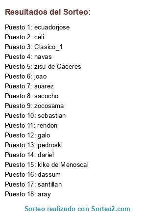 Lista de participantes: Clasico_1, ecuadorjose, celi, sebastian, zisu de Caceres, kike de Menoscal, sacocho, rendon, joao, aray, pedroski, dariel, santillan, galo, suarez, navas, zocosama, dassum.