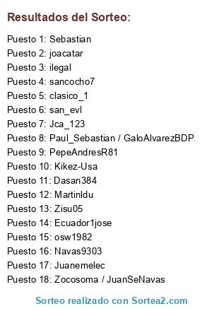 Lista de participantes: PepeAndresR81, Econowak2, Kikez-, KrlozP, oracle1976, Mel_Tamariz, Falcom61, Zisu25, Joaloval, Kholoncillo, Btlibol, Perita, Walterex14, Pelufa10, Navas, Varas, San_evl, Raultm85, Chalo_Bdp, Fabri, Jgmc2008, BullyDeSucre, Moles22, ElBuitro.