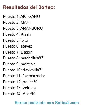 Lista de participantes: stevez, AKTGANO, madridista87, davidvilla7, montibiri, Aitor90, lol.o, MA4, Dagon, vetusta, flacocazador, ARANBURU, potter30, Kiash.