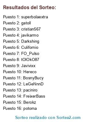 Lista de participantes: tOlOkO87, BosnyBucy, Darkshing, FO_Pulso, Berokz, FreixerBass, Javivixx, LeGeNnnD, Hereco, potoma, superbolaextra, javikarmo, gatoll, cristian567, Culifornio, paciniro.