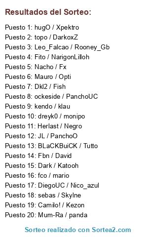 Lista de participantes: hugO / Xpektro, Mauro / Opti, DiegoUC / Nico_azul, Mum-Ra / panda, Camilo! / Kezon, ockeside / PanchoUC, dreyk0 / monipo, Fbn / David, Dkl2 / Fish, BLaCKBuiCK / Tutto, Herlast / Negro, fco / mario, Leo_Falcao / Rooney_Gb, JL / PanchoO, Dark / Katooh, topo / DarkoxZ, Nacho / Fx, sebas / Skylne, kendo / klau, Fito / NarigonLilloh.