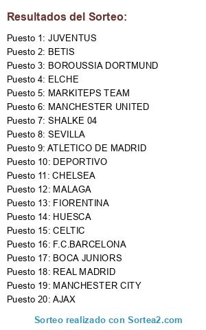 Lista de participantes: BOCA JUNIORS, SEVILLA, DEPORTIVO, HUESCA, MANCHESTER UNITED, JUVENTUS, CELTIC, ELCHE, ATLETICO DE MADRID, CHELSEA, F.C.BARCELONA, BOROUSSIA DORTMUND, FIORENTINA, SHALKE 04, REAL MADRID, MALAGA, BETIS, AJAX, MANCHESTER CITY, MARKITEPS TEAM.
