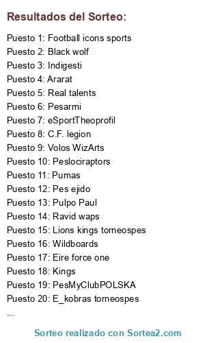 Lista de participantes: Halcones torneospes, Turkic kaghanate, Pesarmi, E_kobras torneospes, It torneospes, Chapespacense torneospes, Lions kings torneospes, Atletico Ceuta, Max power sport, Real talents, Gorilas del Pes, C.F. legion, Cosmos, Pumas, Grow up, Pes antisoccer, Ligapes, Ravid waps, Sharks Of Pes, Indigesti, Gladiators, eSportTheoprofil, Swaat, Sudpes, Ararat, Eire force one, Entregados, Legend 11, Spartans Esports, Phanters, Wildboards, Night WOLVES, +39PesL3g3nd, PWS proyect, Pes ejido, Pulpo Paul, Football icons sports, Turkish Wolves, Volos WizArts, FC galli azurri, Black wolf, Pes samurai, Kings, PesMyClubPOLSKA, Fenix, Melilla sports, Peslociraptors, La mina PES.