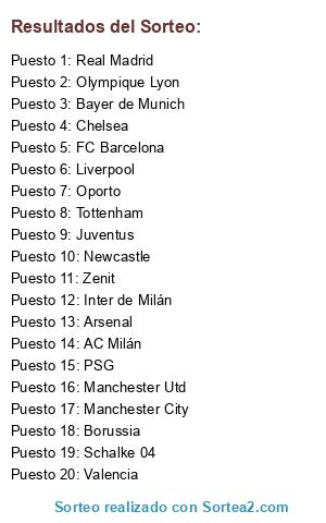 Lista de participantes: Bayer de Munich, Chelsea, FC Barcelona, Manchester City, Real Madrid, PSG, Tottenham, Zenit, Manchester Utd, Valencia, Juventus, Arsenal, Liverpool, Borussia, Schalke 04, Olympique Lyon, Newcastle, Oporto, AC Milán, Inter de Milán.