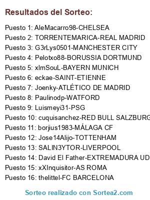 Lista de participantes: eckae-SAINT-ETIENNE, Pelotxo88-BORUSSIA DORTMUND, xXInquisitor-AS ROMA, Jose14Alijo-TOTTENHAM, xlmSouL-BAYERN MUNICH, thelittel-FC BARCELONA, Joenky-ATLÉTICO DE MADRID, SALIN3YTOR-LIVERPOOL, borjius1983-MÁLAGA CF, David El Father-EXTREMADURA UD, cuquisanchez-RED BULL SALZBURGO, Paulinodp-WATFORD, AleMacarro98-CHELSEA, TORRENTEMARICA-REAL MADRID, G3rLys0501-MANCHESTER CITY, Luismeyi31-PSG.