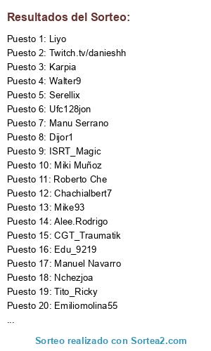 Lista de participantes: Nchezjoa, Miki Muñoz, Alee.Rodrigo, ISRT_Magic, Chachialbert7, Edu_9219, Ignars2, Liyo, Ufc128jon, Emiliomolina55, CGT_Traumatik, Manuel Navarro, Twitch.tv/danieshh, Karpia, Tito_Ricky, Mike93, Dijor1, Walter9, Nehui, Duduatm, Roberto Che, Cano850, FFC_Sennalauda12, Serellix, K3RB0, Broonkoo33, Manu Serrano, ESR.Edward.