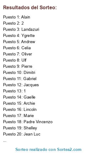 Lista de participantes: Alain, Andrew, Archie, Celia, Dimitri, Fabian, Francine, Gabriel, Gaelle, Jacques, Jean Luc, Landazuri, Lincoln, Luc, Marie, Oliver, Padre Vincenzo, Pierre, Shelley, Ulf, Ygrette, 1, 2.