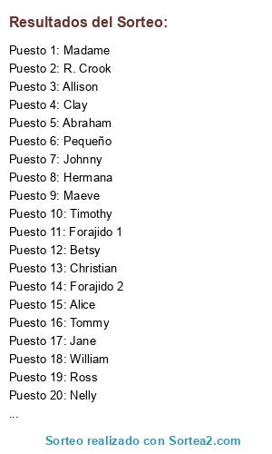 Lista de participantes: Abraham, Alice, Allison, Betsy, Christian, Clay, Dave, Hermana, Jane, Johnny, Lupita, Madame, Maeve, Nelly, Pequeño, R. Crook, Ross, Timothy, Tommy, William, Forajido 1, Forajido 2.