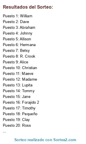 Lista de participantes: Abraham, Alice, Allison, Betsy, Christian, Clay, Dave, Hermana, Jane, Johnny, Lupita, Madame, Maeve, Nelly, Pequeño, R. Crook, Ross, Timothy, Tommy, William, Forajido 1, Forajido 2.