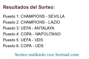Lista de participantes: COPA - UDS, COPA - NAPOLITANO, UEFA - ANTALAYA, UEFA - UDS, CHAMPIONS - LAZIO, CHAMPIONS - SEVILLA.