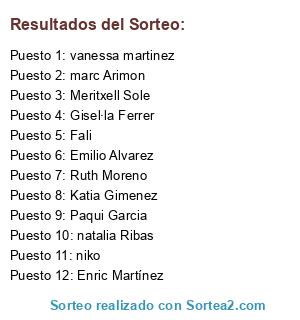 Lista de participantes: Paqui Garcia, Emilio Alvarez, Fali(2 participaciones), Enric Martínez, niko, marc Arimon, natalia Ribas, Gisel·la Ferrer(3 participaciones), Ruth Moreno, Katia Gimenez(2 participaciones), Meritxell Sole(5 participaciones), vanessa martinez(4 participaciones).