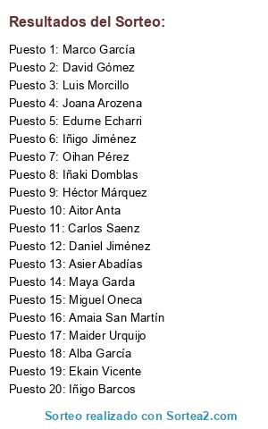 Lista de participantes: Iñigo Jiménez, Edurne Echarri, Héctor Márquez, Galder Sagardoy, Galder Sagardoy, Aitor San Martín, Amaia San Martín, Ainhoa Larraya, Ekaitz Oroz, Ekaitz Oroz, Aitor Anta, Aitor Anta, Asier Abadías, Asier Abadías, Oihan Pérez, Maider Urquijo, Aitana García, Miguel Oneca, Ane Zabalza, Leire Zabalza, Maider Fernández, David Gómez, David Gómez, Unai Nagore, Unai Nagore, Luis Morcillo, Luis Morcillo, Luis Morcillo, Reuben Naran, Carlos Saenz, Edurne Echarri, Edurne Echarri, Xabier López de Dicastillo, Xabier López de Dicastillo, Ekain Vicente, Oihan Egozkue, Joana Arozena, Maya Garda, Samuel Martín, Itziar Napal, Jon Pagola, Iñaki Domblas, Daniel Jiménez, Alba García, Marco García, Nicolás Muñoz, Iñigo Barcos, Marco García, Luis Morcillo, Luis Morcillo, Alfredo Castillo, Iñigo Jiménez, Daniel Jiménez.