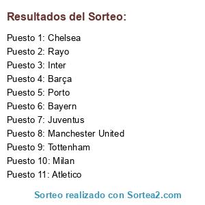Lista de participantes: Juventus, Inter, Rayo, Bayern, Milan, Barça, Manchester United, Chelsea, Porto, Tottenham, Atletico.