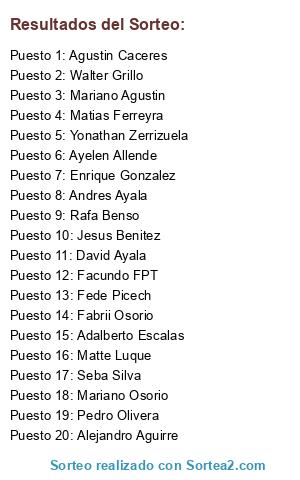 Lista de participantes: Agustin Caceres, Fabrii Osorio, Seba Silva, Walter Grillo, Fede Picech, Mariano Osorio, Alejandro Aguirre, Enrique Gonzalez, Rafa Benso, Matte Luque, Yonathan Zerrizuela, Jesus Benitez, Ayelen Allende, Adalberto Escalas, Matias Ferreyra, Pedro Olivera, Facundo FPT, David Ayala, Andres Ayala, Mariano Agustin.