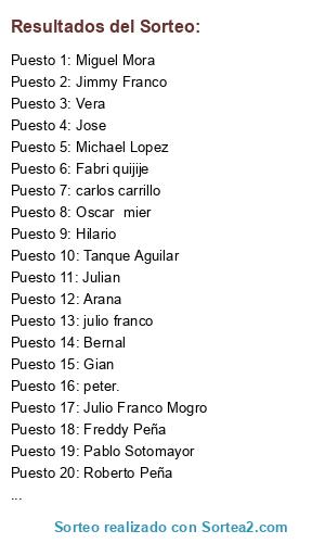 Lista de participantes: Gregorio, Hilario, Bernal, Leo, Miguel Mora, Vera, Gian, David Guzman, Roberto Peña, Gabriel Toala, Raul Zambrano, Freddy Peña, Julian, Jose, Michael Lopez, Danilo, ecuafut, andy, Pablo Sotomayor, Carlos Caceres, Dario Morla, Oscar mier, peter., julio franco, carlos carrillo, Arana, Julio Franco Mogro, Fabri quijije, Jimmy Franco, Tanque Aguilar.