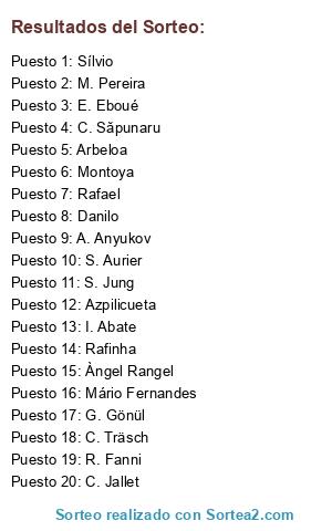 Lista de participantes: Danilo, Montoya, Rafael, Azpilicueta, I. Abate, C. Jallet, A. Anyukov, Arbeloa, G. Gönül, E. Eboué, S. Jung, Sílvio, C. Träsch, M. Pereira, Rafinha, C. Săpunaru, Àngel Rangel, R. Fanni, S. Aurier, Mário Fernandes.