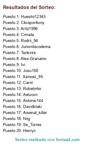 Lista de participantes: Alex-Granaino, Josu150, Antonio144, Davidblaki, Tankvire, Se_Torres, Cliosporttony, Xanxez_95, Henryc, Astucon, Carrir, Rodrii_94, Arsenal_killer, Huesito12345, Aritz1996, Ivi, Niig, Robetinho, Crmata, Juniordecodema.