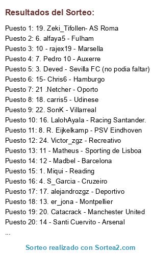 Lista de participantes: 1. Miqui - Reading, 2. Jony4 - Borussia Monchengladbach, 3. Deved - Sevilla FC (no podia faltar), 4. S_Garcia - Cruzeiro, 5.makinon63-palermo, 6. alfaya5 - Fulham, 7. Pedro 10 - Auxerre, 8. R. Eijkelkamp - PSV Eindhoven, 9. Armadon - CSKA Moscu, 10 - rajex19 - Marsella, 11 - Matheus - Sporting de Lisboa, 12 - Madbel - Barcelona, 13. er_jona - Montpellier, 14 - Santi Cuervito - Arsenal, 15- Chris6 - Hamburgo, 16. LalohAyala - Racing Santander., 17. alejandrozgz - Deportivo, 18. carris5 - Udinese, 19. Zeki_Tifollen- AS Roma, 20. Catacrack - Manchester United, 21 .Netcher - Oporto, 22. SonK - Villarreal, 23. Diego_Uruguay - Eintracht, 24. Victor_zgz - Recreativo.