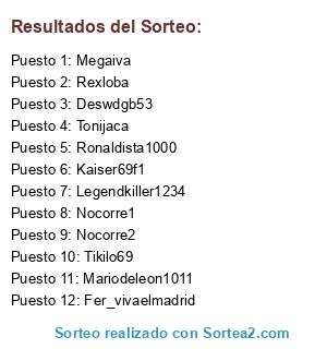 Lista de participantes: Ronaldista1000, Kaiser69f1, Megaiva, Fer_vivaelmadrid, Tonijaca, Rexloba, Mariodeleon1011, Deswdgb53, Tikilo69, Legendkiller1234, Nocorre1, Nocorre2.